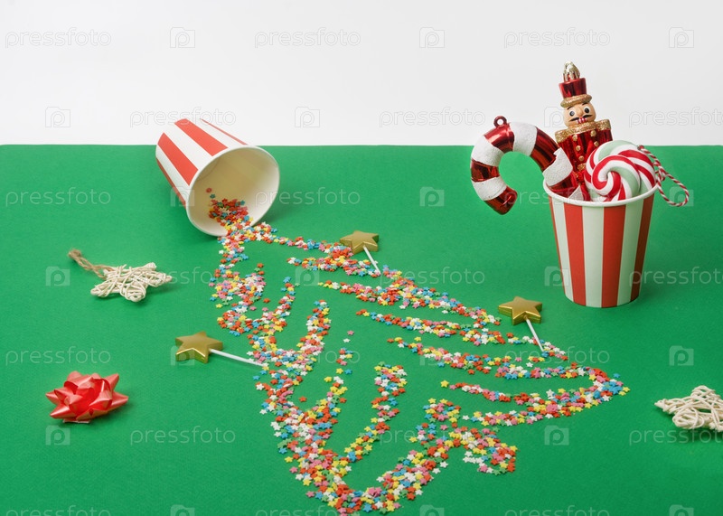 Сахарные звезды в форме рождественской елки разбросаны на зеленом фоне вместе с украшениями деревьев