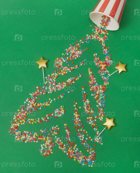 Звезды сахара разбросаны на зеленом фоне в форме рождественской елки. вид сверху, плоский лежащий