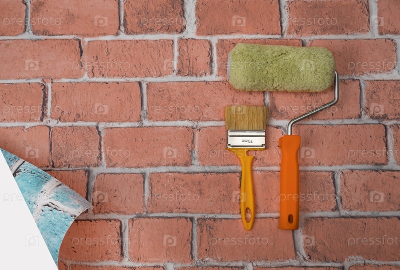 Творческий фон обновления. Ролик и кисть расположены на кирпичном фоне. Инструменты реконструкции