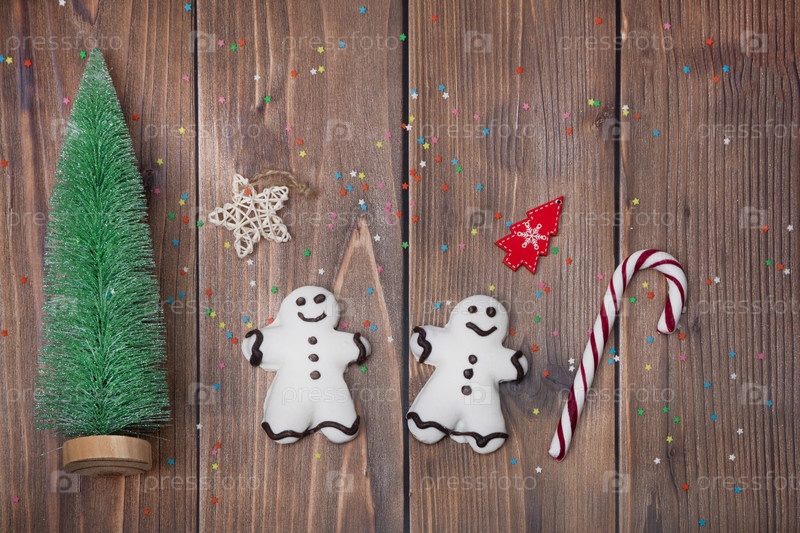 Рождественская композиция.Рождественская елка, два имбирных тоста и звезды на деревянном фоне.Креативный планар