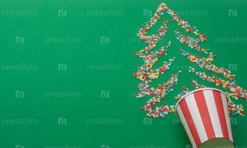 Многоцветные сахарные звезды в форме рождественской елки разбросаны на зеленом фоне