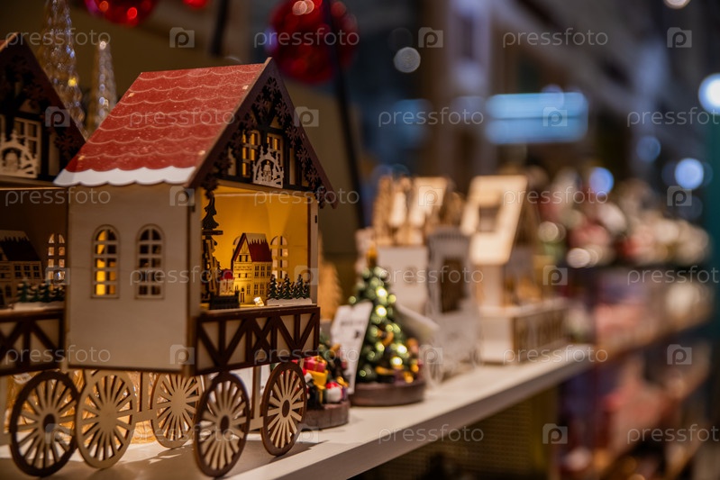Деревянный рождественский дом с миниатюрной освещенной сценой внутри, праздничная выставка для концепции зимнего сезона