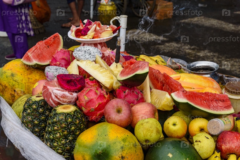 Яркий фургон продавца фруктов, загруженный тропическими деликатесами