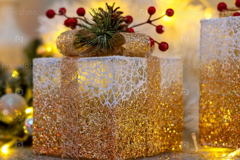 Элегантные рождественские светящиеся коробки для подарков с золотым блеском, украшенные красными ягодами и ветками елей