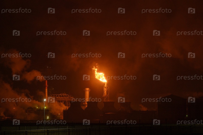 Промышленная вспышка сжигает избыточный газ с большим ярко-оранжевым пламенем и густым дымом на темном ночном небе, подчеркивая производство энергии и потенциальное воздействие на окружающую среду