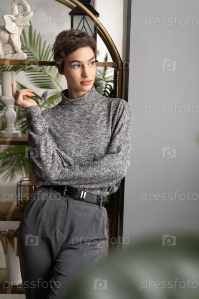 Красивая молодая женщина позирует в сером свитере в студии
