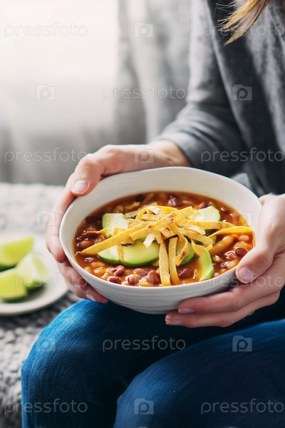 Уютная миска чили с кусочками авокадо в руке