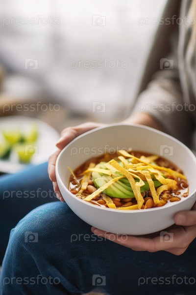 Уютная миска чили с кусочками авокадо в руке