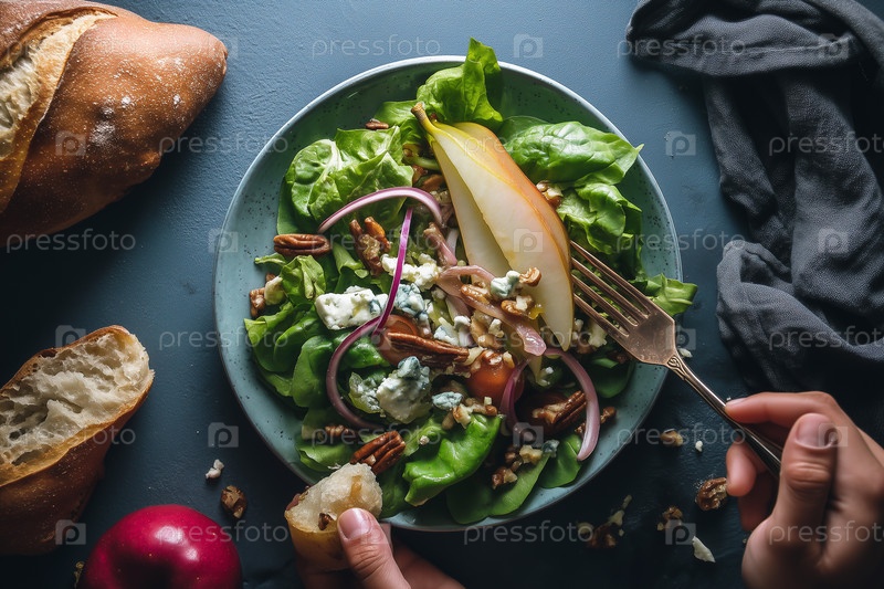 Свежий зеленый салат с грушей, грецкими орехами и синим сыром