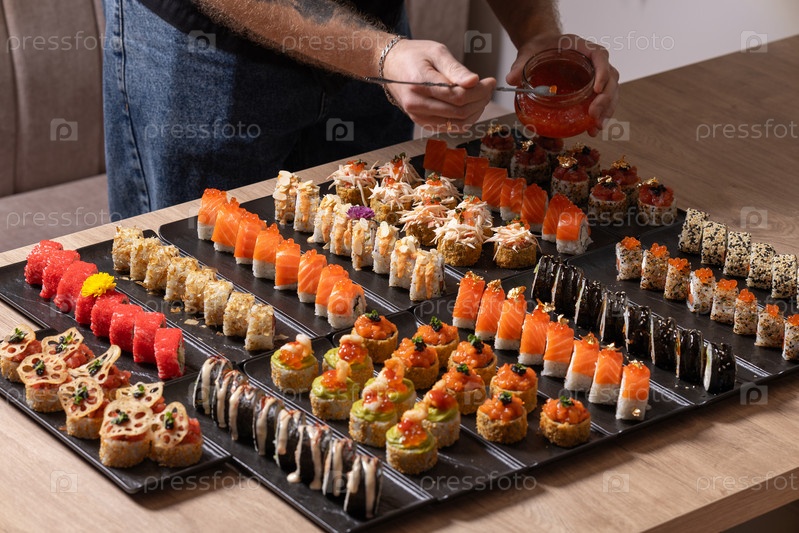 Мужчина элегантно посыпает соус на роскошную, большую гурманскую тарелку с различными рулонами суши, включая лосося, красный икры и съедобные золотые начинки, идеально подходящие для элитной кухни и общественного питания