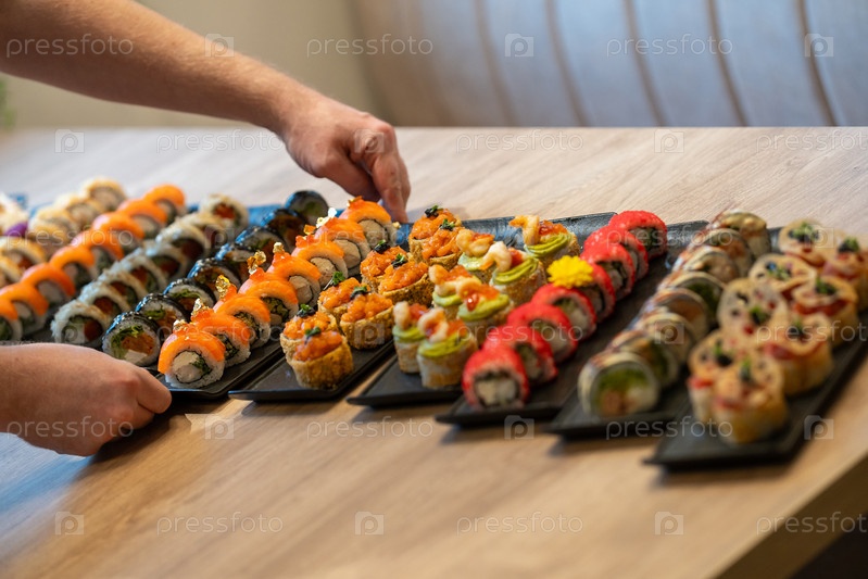 Человеческие руки устраивают множество больших, изысканных блюд из различных рулонов суши