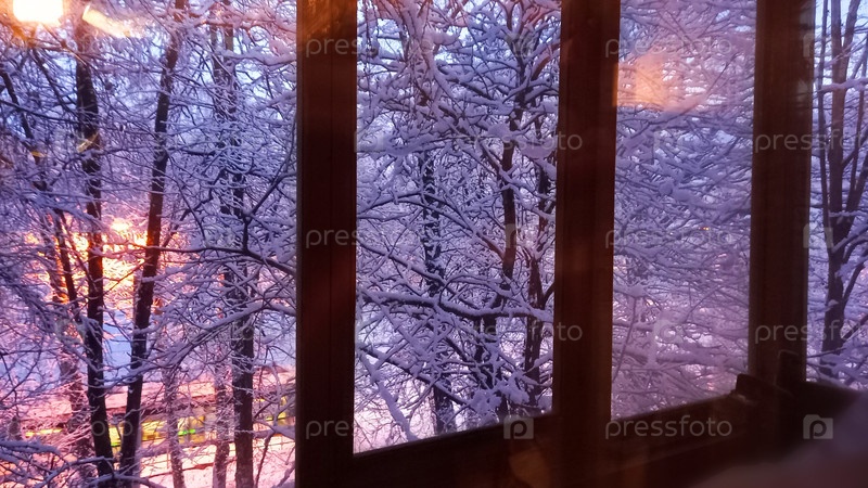 Снежные деревья, вид с деревянного остекленного балкона зимнего вечера, синий час света в оттенках фиолетового и розового