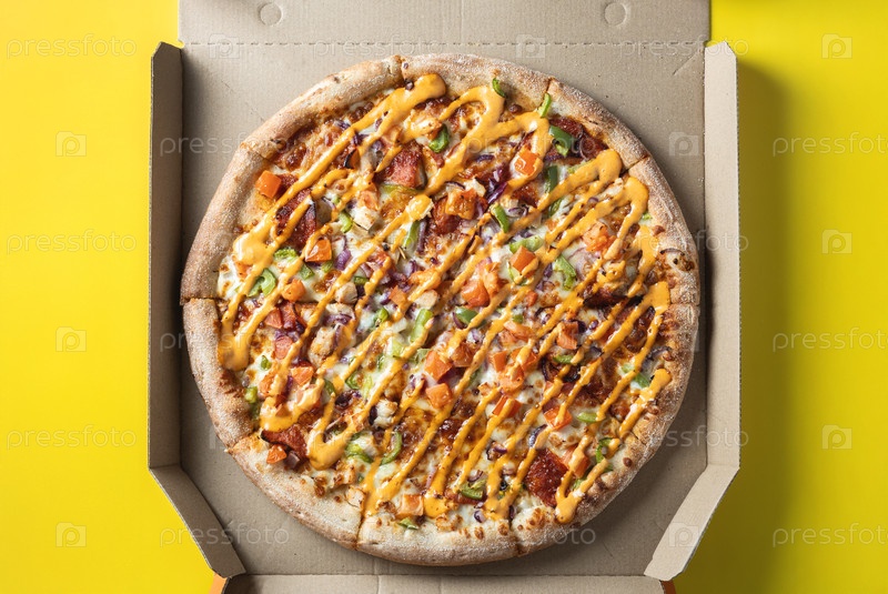 Вид на свежую пиццу в открытой коробке на желтом фоне