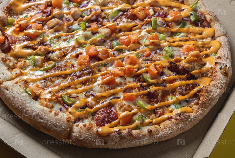 Закрытие свежевыпеченной пиццы с красочными начинками