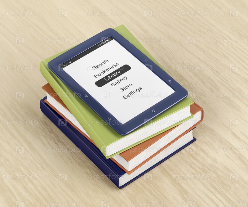 Читатель электронных книг над красочными книгами
