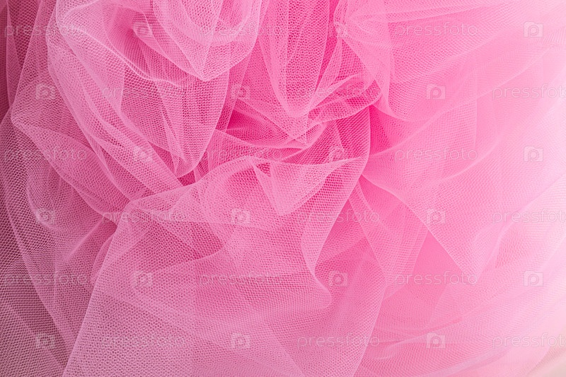 Свернутая прозрачная ткань розового цвета. Элегантные складки занавески в нежной розовой завесе. Вид сверху. Мокап для праздничного дизайна. Абстрактный фон