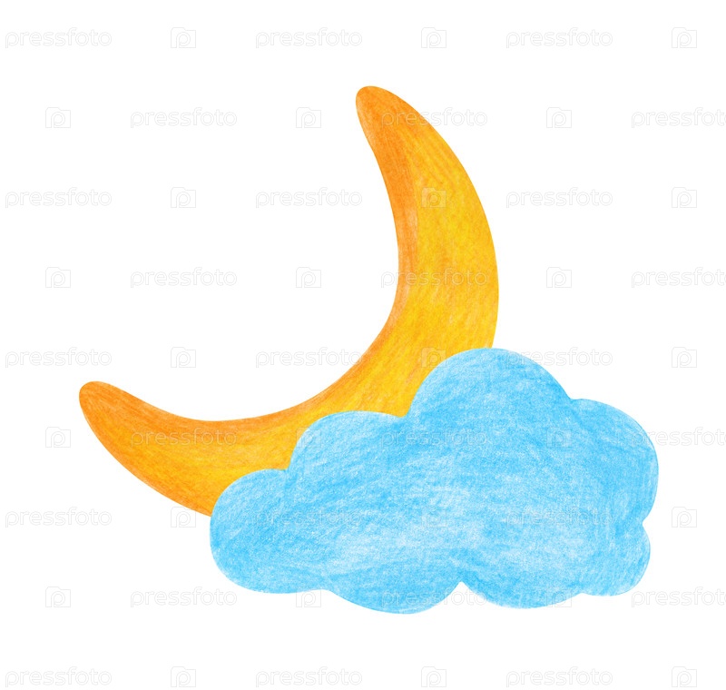 Луна скрывается в облаке. Рисуй цветными карандашами. Желтая луна за голубым облаком. Время ложиться спать. Рисунок ребенка. Шаблон для детской комнаты, текстиль и наклейки