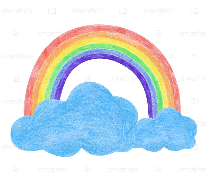 Яркая круглая радуга, окруженная голубыми облаками, нарисована вручную. Рисунок цветными карандашами изолирован на белом фоне. Рисунок ребенка. Многоцветной шаблон для детских стикеров, текстиля, обоев, книг