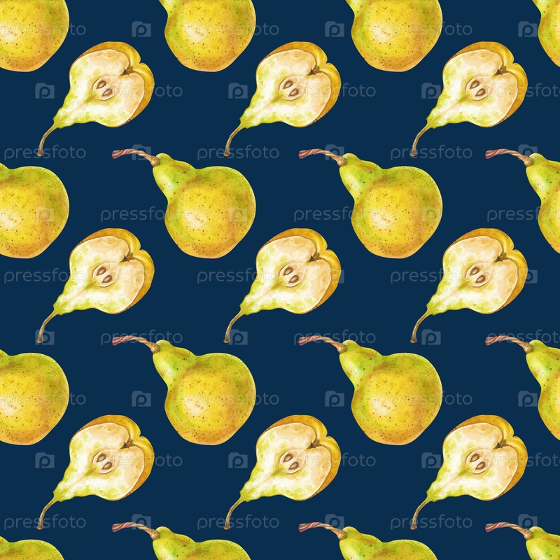 Акварельный бесшовный рисунок с желтыми грушами. Целые груши и половинки на темном фоне. Ботанический бесшовный фон со сладкими сезонными фруктами. Для упаковки, обоев, скарапбукинга, текстиля и посуды