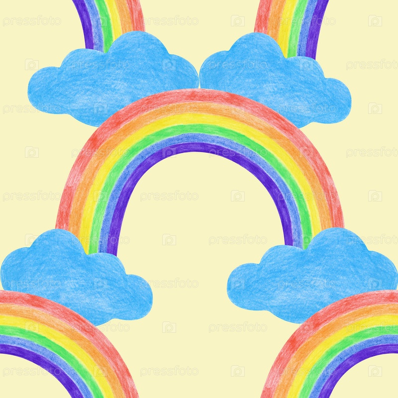 Дизайн с многоцветной радугой и облаками на желтом фоне. Детский рисунок цветными карандашами для текстиля, упаковки, обоев