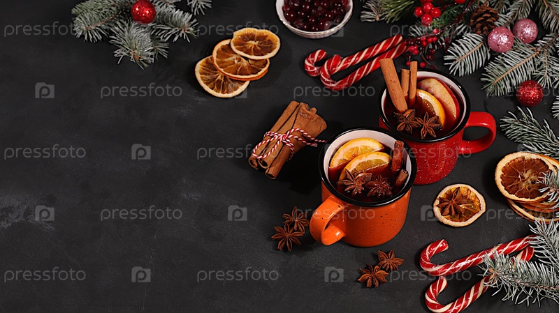 Сильный алкогольный или безалкогольный коктейль в железном горячем вине с пряностями, звездным анисом, клюквами, апельсином, яблоком и корицей, согревающий зимний напиток в холодный сезон, рождественский грег,