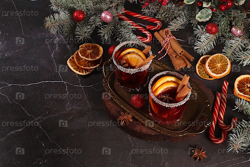 Теплый зимний напиток в холодный сезон, праздничный рождественский григ, крепкий алкогольный или безалкогольный коктейль на праздничном столе, горячее вино с пряностями, звездный анис, клюквы, апельсин, яблоко