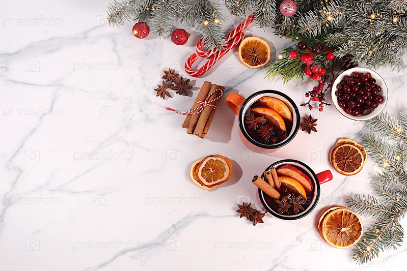 Согревающий зимний напиток в холодный сезон, праздничный рождественский григ, крепкий алкогольный или безалкогольный коктейль в железном горячем вине с пряностями, звездным анисом, клюквами, апельсином, яблоком