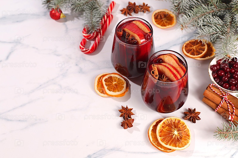 Теплый зимний напиток в холодный сезон, праздничный рождественский григ, крепкий алкогольный или безалкогольный коктейль на праздничном столе, горячее вино с пряностями, звездный анис, клюквы, апельсин, яблоко