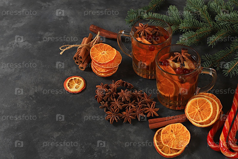 Теплый зимний напиток в холодный сезон, праздничный рождественский григ, крепкий алкогольный или безалкогольный коктейль на праздничном столе, горячее вино с пряностями, звездный анис, клюквы, апельсин, яблоко