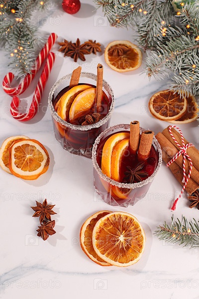 Сильный алкогольный или безалкогольный коктейль, горячее вино с специями, звездный анис, клюквы, апельсин, яблоки и корица, согревающий зимний напиток в холодный сезон, рождественский грег,
