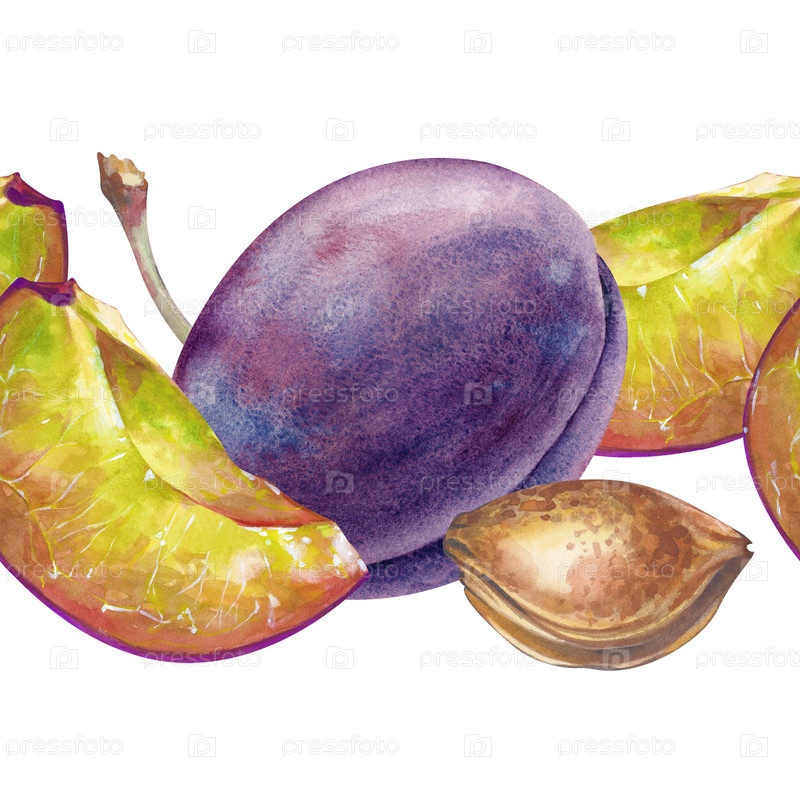 Акварель с бесшовной границей со зрелыми сливами. Ручная иллюстрация, изображающая целые сливы и их кусочки, семена и ветви на белом фоне. Ботаническая бесшовная рама с сочными сезонными плодами. Для упаковки, обоев, текстиля для кухни и посуды