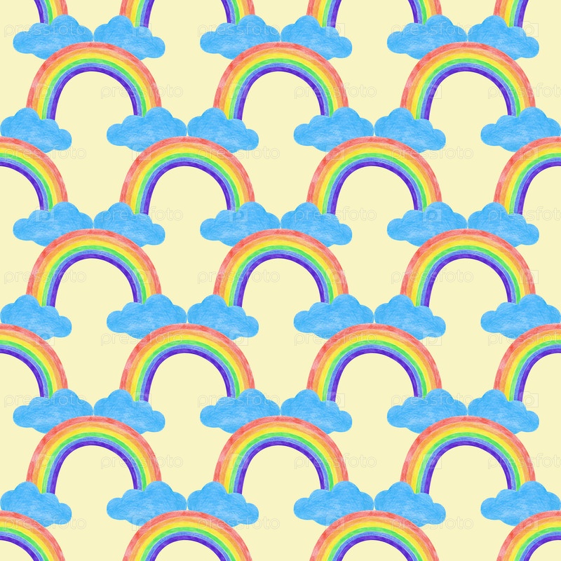 Бесшовный яркий узор, выполненный цветными карандашами. Рисунок с многоцветной радугой и облаками на желтом фоне. Детский рисунок для текстиля, упаковки, обоев
