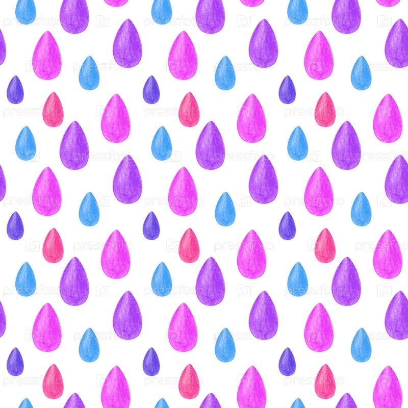 Бесшовный рисунок с розовыми и фиолетовыми каплями, нарисованные цветными карандашами. Рисование красочных капель дождя на белом фоне. бесшовный фон для детской обои, упаковки, текстиля