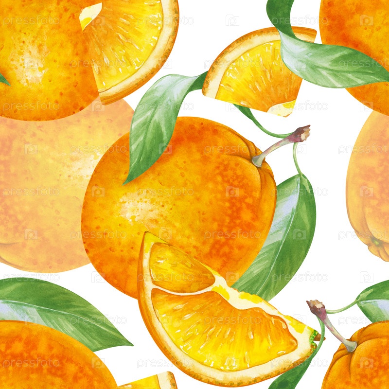 Бесшовный рисунок с апельсинами и зелеными листьями нарисован вручную. Иллюстрация акварели с фруктами выделена на белом фоне. Ботанический бесшовный шаблон для упаковки, текстиля и обоев