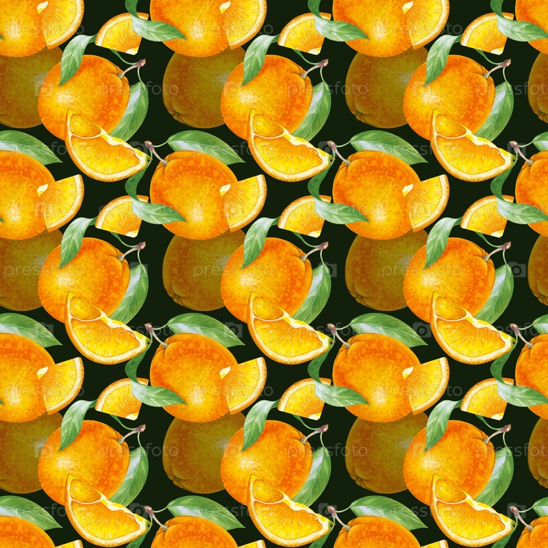 Бесшовный рисунок с апельсинами, ломтиками и зелеными листьями на черном фоне. Иллюстрация акварели с сочными фруктами нарисована вручную. Ботанический бесшовный шаблон для упаковки, текстиля, обоев и посуды
