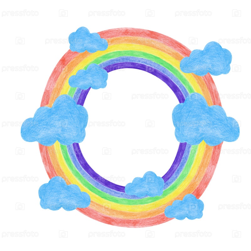 Круглый каркас из радуги и голубых облаков, нарисованный вручную. Рисуйте цветными карандашами. Картина ребенка изолирована на белом фоне. Положительный яркий узор с пустым пространством для вставки