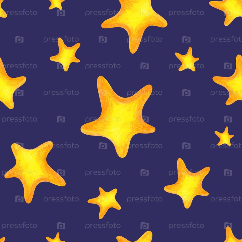 Бесшовный рисунок с золотыми звездами на синем фоне, нарисованный карандашом. Рисование цветными карандашами на темном фоне. Рисунк ребенка. Для текстиля, обоев для детской комнаты или упаковки подарков