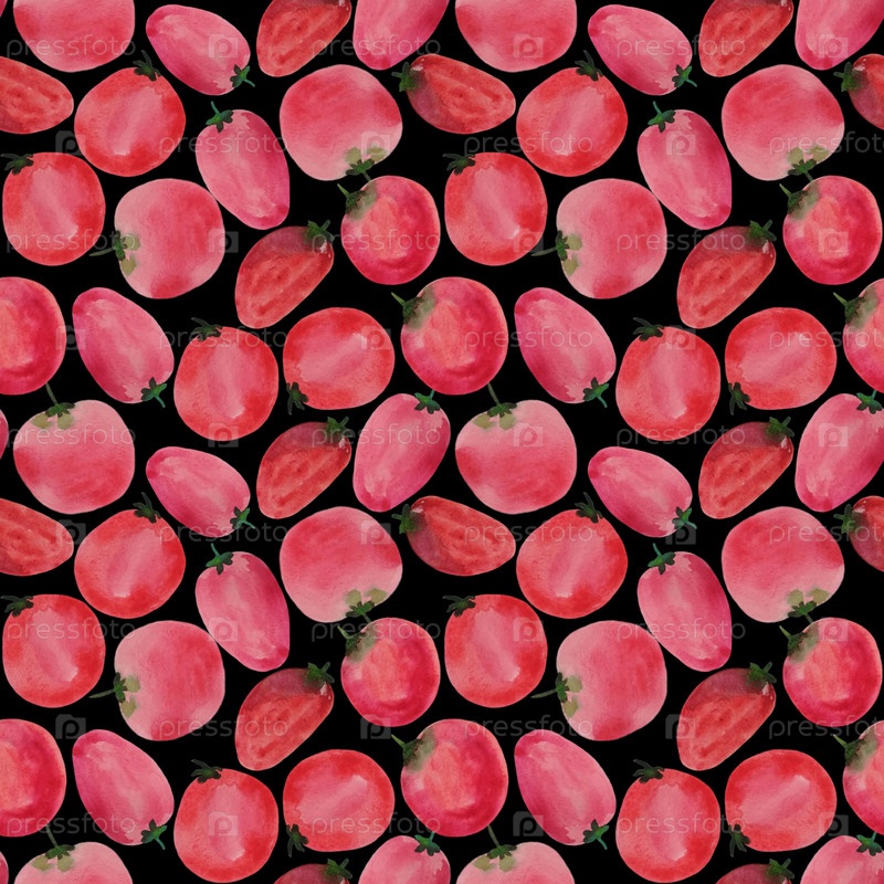 Бесшовный рисунок, красные помидоры на черном фоне. ручная акварель. может применяться к ткани, обои, открыткам, упаковке