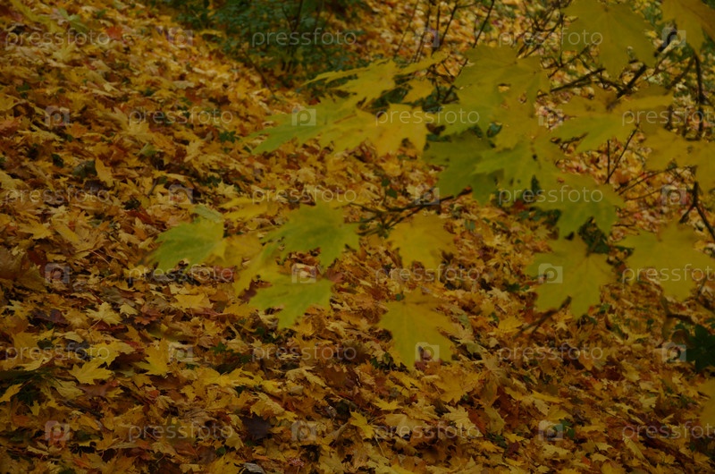 Желтые и зеленые кленовые листья на фоне яркого ковра из красочных клёновых листьев, осень в Ботаническом саду Петра Великого в Санкт-Петербурге