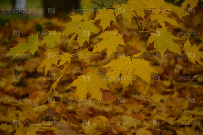 Желтые кленовые листья на фоне яркого ковра из красочных клёновых листьев, осень в Ботаническом саду Петра Великого в Санкт-Петербурге