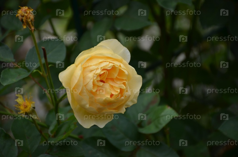 Большой кремовый желтый цветочный сад возник на фоне темно-зеленых листьев