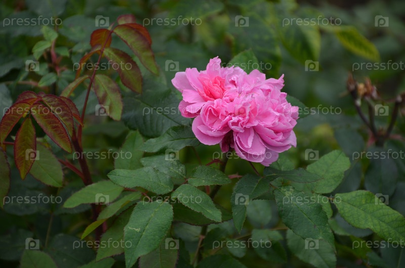 Большой розовый цветок сада поднялся на фоне темно-зеленых листьев