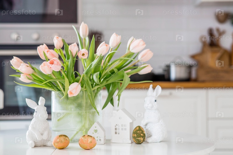Красивая пасхальная открытка. букет нежных тюльпанов, пасхальных кроликов и золотых яиц на столе в белом кухонном интерьере