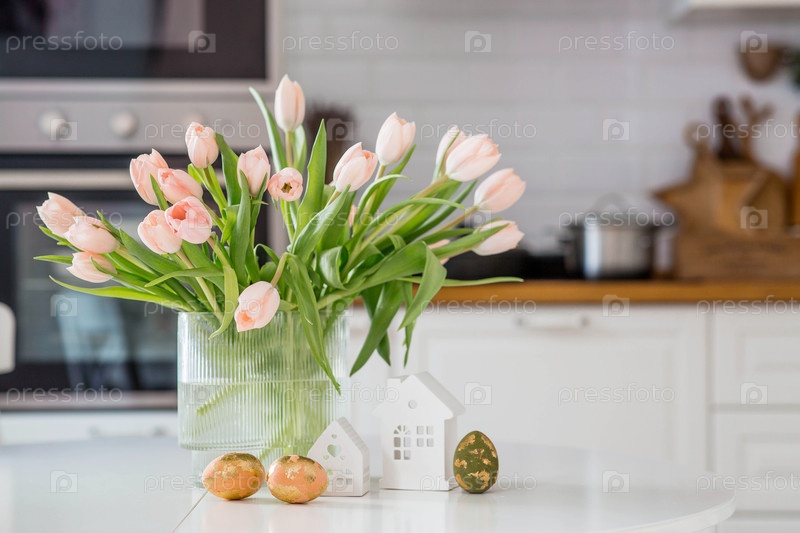 Красивая пасхальная открытка. букет нежных тюльпанов, пасхальных кроликов и золотых яиц на столе в белом кухонном интерьере