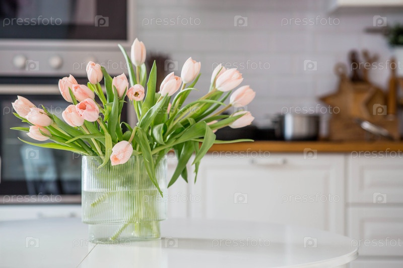 Концепция приурочена к наступлению весны и Международному женскому дню 8 марта. букет весенних, нежных розовых тюльпанов в красивой стильной вазе на столе