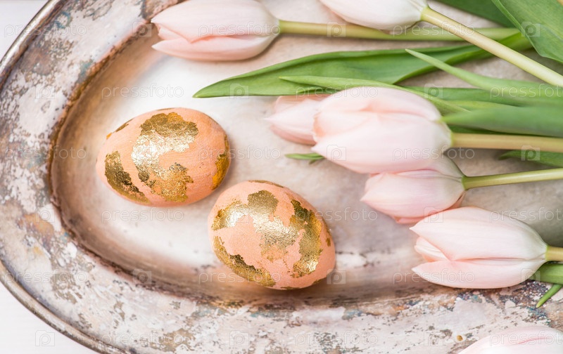 Нежные пасхальные яйца в розовых, золотых и зеленых тонах и тонкие розовые цветы тюльпанов