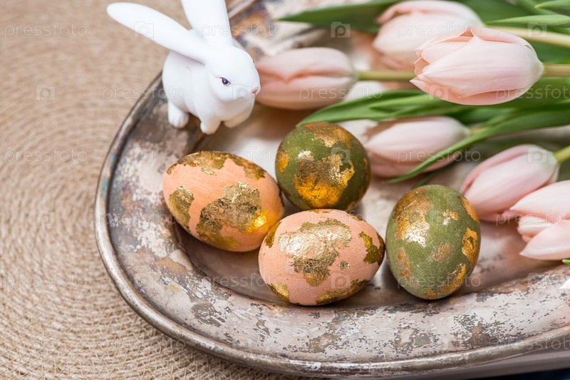 Нежные пасхальные яйца в розовых, золотых и зеленых тонах и тонкие розовые цветы тюльпанов