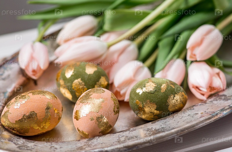 Нежные пасхальные яйца в розовых, золотых и зеленых тонах и тонкие розовые цветы тюльпанов