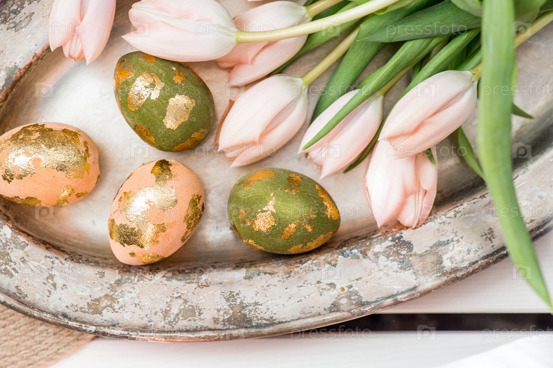 Нежные пасхальные яйца в розовых, золотых и зеленых тонах и тонкие розовые цветы тюльпанов