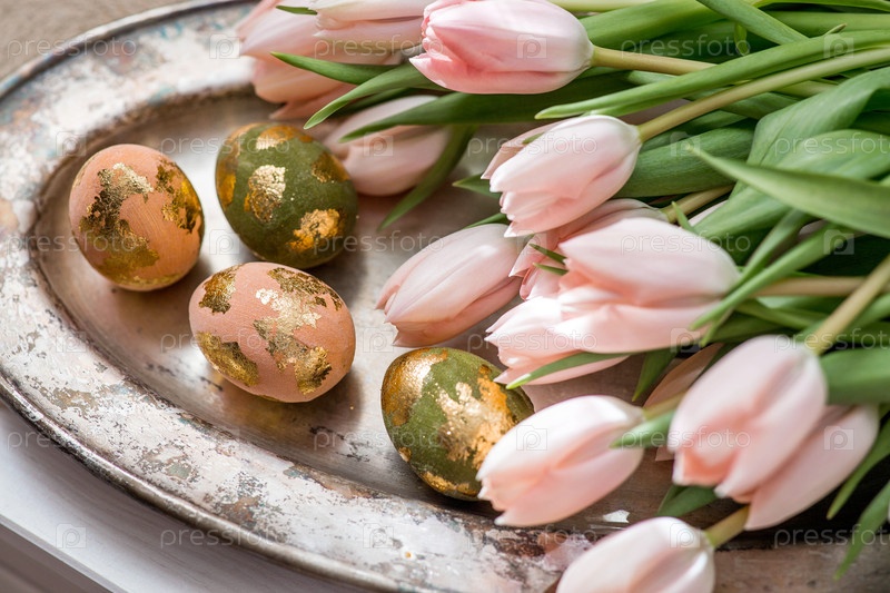 Нежные пасхальные яйца в розовых, золотых и зеленых тонах и тонкие розовые цветы тюльпанов